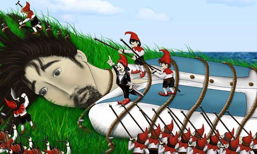 Ada banyak laki-laki kecil sekali disekitar Gulliver. Mereka mengikat Gulliver ke tanah. Gulliver mencoba untuk bangun. Tiba-tiba Gulliver merasa sakit. Orang-orang memanahnya. Gulliver Berhenti menggerakkan tubuhnya.