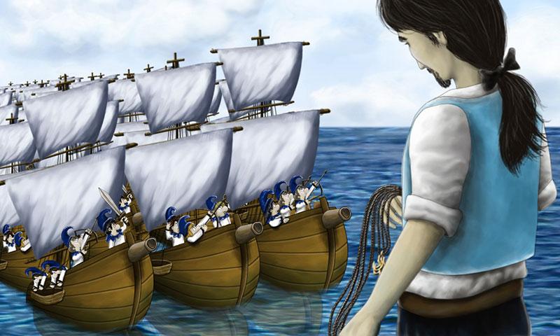 Ada banyak kapal di pelabuhan. Gulliver mencoba mengikat kapal mereka. Menarik kembali kapal-kapal itu ke negeri Liliput. Kaisar sangat senang. "Bawa lebih banyak kapal lagi!" kata kaisar. " Aku ingin membuat orang orang Blefuscu menjadi budak!"